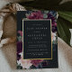 Chic floral baby shower invitation features a border of burgundy marsala purple, blush pink, and dusty blue flowers, with lush botanical foliage and greenery and gold foil trim. Personalize with your baby shower details in modern lettering on a rich charcoal background.