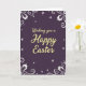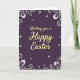 This greeting card features the message “Wishing you a Happy Easter” centered in creamy yellow lettering against a rich plum background. The letters have smooth, flowing strokes that feel like a gentle note shared between close friends, with the words spaced evenly for an easy read. Around the edges, delicate white floral and leafy curls frame the scene, with each corner holding a matching flourish that leans inward like an embrace. Tiny white star shapes are sprinkled across the dark backdrop, adding a soft, night-sky sparkle that pairs nicely with the spring flowers 🌷. The color mix of deep violet, ivory white, and warm yellow creates a calm, romantic tone without needing any characters on the front. The text sits in the middle while the decorative elements stay mostly in the corners, keeping the focus on the greeting 🐰. White vines and small blossoms curl outward from each corner, and scattered star specks dot the plum field behind the centered yellow words.
