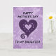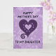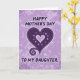 This card shows a large deep-plum heart centered on a luminous lavender background, with a soft, speckled texture that feels gentle and affectionate ❤️. A dashed outline traces the big heart like careful stitching, adding a tender, close-to-home touch. Nestled inside is a smaller glowing heart, suggesting a quiet bond held safely at the center. From the lower left of the main heart, a smooth curling flourish sweeps outward, like a graceful gesture shared between loved ones. The words “HAPPY MOTHER’S DAY” sit above the heart and “TO MY DAUGHTER” sits below it, both in a dark tone with a faint violet glow that helps them stand out. Subtle circular accents appear within the larger heart, their details softly blurred, like private moments remembered with warmth 🌼. The overall palette moves through lilac and purple shades, and the heart’s inner glow creates a gentle halo against the background. Tiny diffused specks are scattered across the lavender field behind the heart.