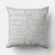 A 20 inch square cotton pillow listing the things that make Plum Island, MA special. Includes the latitude and longitude address, 2B2 the airport call sign, Plum Island Light, Newburyport and Newbury.