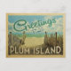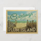 This Greetings From Plum Island vintage postcard design features a sandy beach with a beautiful turquoise ocean water and above the sea, a blue sky with billowy white clouds. In vintage travels style.