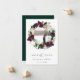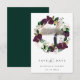 Modern and elegant plum purple and ivory floral wreath, Photo Save the Date Card. Wreath features rich green and golden leafy greenery, beautiful dark purple and ivory white flowers. Elegant and simple typography design. Backing color, shown in rich emerald green, can be customized.