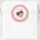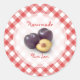 Customizable retro stickers for homemade plum jam, jelly, marmalade or preserves jars with fresh plums on red and white gingham tablecloth pattern.