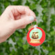The seasonal winter british pudding in a snow globe. Topped with frosting and a holly sprig. In colors of red, brown, white and green.