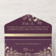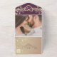 An elegant and luxurious all-in-one wedding invitation in rich plum purple, blending modern chic with timeless romance. Featuring a romantic rope heart, a monogram on the front, vintage gold flowers, and a custom photo of the couple on the back. Personalize with your own photo, wedding details, and RSVP for a truly unforgettable invitation.