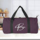 This personalized duffel bag features a monogram and first name in modern gray and white script on a stylish plum purple background.