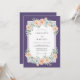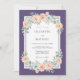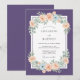 This design features a deep plum background paired with soft watercolor florals. Delicate peach roses and light blue anemones are nestled among muted sage green eucalyptus foliage. The romantic color palette and elegant style create a sophisticated mood for a spring or summer event. Lush botanical elements provide a timeless aesthetic for a classic affair.