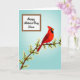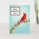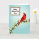 This card shows a bright red songbird perched on a brown branch that angles across the lower middle, surrounded by small white blossoms with yellow centers that feel like a gentle offering ❤️. The bird’s dark face marking and watchful eye add contrast, as if it’s pausing to admire someone nearby in a quiet, affectionate moment. A soft blue gradient fills the background, giving the scene open, airy space like a calm spring morning. In the upper-left area, a white rectangular panel holds the message, set neatly away from the bird so the art still leads the eye. The lettering is flowing and elegant, printed in a dark ink that stands out clearly against the white panel. The balance between the cool sky tones and the warm red feathers creates a tender, friendly push-and-pull, like two people leaning in with unspoken care 🌼. The blossoms cluster along the branch in small groups, each petal outlined gently against the blue backdrop.