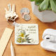 Key ring wedding favors with Hawaiian plumeria flowers and text on both sides. Square key chain is off-white with a leafy flourish and white frangipani flowers with yellow centers. Text is modern script in black with names and wedding date on one side, and “thanks for being here” text on the other.