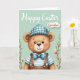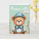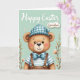 This design shows a plush-like bear centered on a pale mint green background, looking straight ahead with wide eyes, a small upturned smile, and rosy cheeks that suggest a gentle, friendly affection. It wears a blue-and-white striped shirt under brown overalls with tiny golden buttons, and the neat outfit gives it a sweet, ready-to-visit-a-friend look. A blue bow tie sits at the neck, catching a bit of soft light, while a blue-and-white checked cap with a little bobble tilts slightly for extra charm 🐰. On both sides, slim spring sprigs rise like a frame, each dotted with small orange-pink buds and a few scattered star shapes for a light sparkle 🌷. Near the top, a white greeting is placed in flowing lettering, standing out clearly against the mint background. Just beneath that, a short dedication sits inside a soft, cloud-like shape, centered above the bear’s head. The fur texture looks fuzzy and touchable, contrasting with the smoother shine of the bow tie and the crisp lines of the striped shirt.