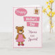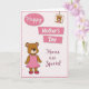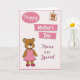 This card features a sweet digital illustration of an anthropomorphic plush bear in warm brown tones, standing near the lower left in a pink dress with a subtle plaid pattern and matching shoes. The bear’s wide dark eyes and gentle smile give it a tender, affectionate look, like it’s quietly sharing love with the viewer ❤️. Soft, even lighting keeps the palette mostly pinks, creams, and browns, creating a cozy, friendly setting. A fuchsia-and-white gingham border frames the entire design like a comforting fabric edge. In the upper half, the word “Happy” sits near the top, “Mother’s Day” appears larger beneath it, and “Moms are Special” is placed nearby, with the lettering alternating between white and deep burgundy for contrast. A small framed portrait of the bear’s head hangs in the upper right on a thin string, like a little keepsake tag 🌼. The background is a lightly textured cream-to-pale-pink field behind the bear and text.