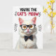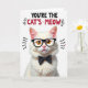 This card features a close-up portrait of a well-dressed white cat set against a bright white background, giving the scene a light, airy feel. The cat looks straight ahead with golden-yellow eyes that seem calmly attentive, as if holding a fond gaze meant for someone special ❤️. Dark-rimmed glasses sit neatly on its face, adding a smart, charming touch, while a small pink nose softens the look. A dark bow tie with small white polka dots rests at the neck, suggesting a dressed-up moment like a cozy date or a friendly celebration. Across the top, the text reads “YOU’RE THE CAT’S MEOW,” with most of the letters in black and key words highlighted in red for contrast. Small heart details and wavy accent lines sit around the lettering, echoing a flirty, affectionate tone without needing extra words 🌼. Bright, even lighting brings out the fluffy fur texture, the crisp edges of the glasses, and the dotted pattern on the bow tie.