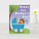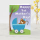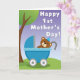 This card shows a round, plush-like brown animal peeking sweetly from a bright blue baby carriage, as if sharing a shy little grin with someone just off to the side ❤️. A small light-blue cone party hat sits on its head, adding to the gentle celebration mood. On the left, a sturdy brown tree trunk rises into a leafy green canopy that frames the scene like a quiet garden corner. Rolling green hills stretch beneath the carriage, while the sky fades from soft lavender at the top into pale blue near the horizon for a calm, dreamy backdrop. Along the top rim of the carriage, a lighter blue band is dotted with tiny white circles, giving the design a soft, friendly rhythm. In the upper right, rounded white lettering reads “Happy 1st Mother’s Day!” and stands out clearly against the sky 🌼. The animal’s wide dark eyes and small smile feel like a tender, affectionate hello, like a shared private moment between close family. The carriage’s curved shape and the dotted trim are the crispest details, with the white text floating above them on the right.