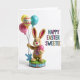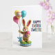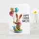 Soft colors and a plush-textured, upright bunny takes center stage on a white background, its long ears tipped with bright pink and its face set in a gentle, affectionate look 🐰. In one paw it holds a small bunch of shiny balloons—yellow, pink, and teal—with one balloon covered in tiny multicolored shapes, as if meant for someone special. Tucked along the balloon strings hangs a small blue outline of a second little bunny, like a quiet companion hovering close by. On its belly, a round sky-blue patch dotted with tiny marks adds a sweet, cozy detail that pairs with the pastel palette. Its other paw cradles a vivid pink egg sprinkled with white dots, suggesting a shared tradition between friends or sweethearts 🌷. Beneath the figure, a circular base looks like bright green grass, bordered by a warm brown ring decorated with small blue floral motifs. To the right, a seasonal greeting appears in chunky, rounded letters, each word in a different cheerful color, arranged in a neat stack. The balloons float above the bunny’s head, and the multicolored greeting sits to the right on the open white space.