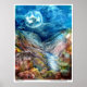 High from a cliff top, the view of the moon on a river far below is decorated by signs from the many who have traveled there. Poster,print.