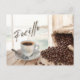 A charming watercolor postcard featuring a cozy scene of a traditional pocillo—a small cup of coffee—resting on a rustic wooden table. Next to it, a burlap bag of freshly roasted coffee beans spills open, their rich aroma almost palpable. In the background, the soft hues of a peaceful beach view, with gentle waves and a bright blue sky, create a serene tropical atmosphere. The blend of the warm coffee scene and the calming seaside setting evokes a perfect moment of relaxation and Puerto Rican charm.