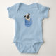 Cute baby boy's light blue one piece bodysuit, with graphic artwork of a pocket with a pug puppy inside. Pocket Pug in graphic text decorates the faux pocket.