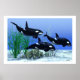 Two female and one male killer whales hunt together in the beautiful clear ocean.