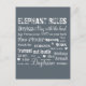 It features a poetic set of Elephants Rules. Set in a beautiful typographic design in white against granite gray, the text invites to relax and dream with these amazing animals.