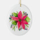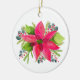 White ornament featuring a brightly colored watercolor poinsettia with sprigs of eucalyptus and evergreen with red berries.