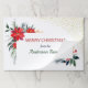 Pretty watercolor images of red Christmas poinsettia flowers are embellished with blue green leaves and pine boughs on these tearaway paper Holiday placemats. A few red berries peek out from behind the white banner that holds your custom text in matching red and green. A smattering of gold confetti at the top right corner adds extra interest.