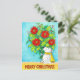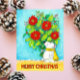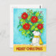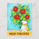 On the right hand side of this card, a polar bear is holding a giant bouquet of red Poinsettias, a traditional christmas flower often used in floral decoration at winter time. The little bear is wearing a bright yellow scarf, fastened witha simple knot at the back of his neck. He is standing before a blue blackground and on a yellow flower on which is written in hand written letters "Merry Christmas". The letters are brown. Tiny white snowflakes are scattered over the painting.