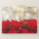 Poinsettia with gold snowflakes on bokeh background and your name.