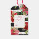 Black and white striped "Merry Christmas" gift tags with assorted red poinsettias, greenery, and pine cones.