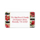 Black and white striped address labels with red, ivory and green poinsettias with greenery, pine cones, evergreen boughs, and berries.
