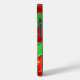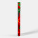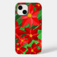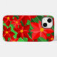 This phone case has a Christmas design of poinsettias scattered around on a field of green stripes.