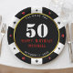 Cool, black, white, red and gold casino poker chip 50th birthday party paper plate. Personalize it with your event details.