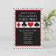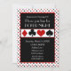 This poker themed party invitation feature a background of a repeating pattern of red diamonds, black spades, red hearts and black clubs. The center of the invitation has template areas for you to personalize with a name and your event information.
