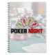A spiral notebook with poker night typography. Background is a faint image with poker chips and playing cards on a green gaming table. Layered over top is a set of 4 cards with boy and girl silhouettes with the text: Poker Night. Written in big bold letters.