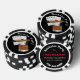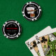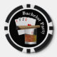 Unique bachelor party invitation done on a poker chip. A black and white striped poker chip has a solid black front and back, with graphics, on the front, of a poker hand, cigar, and drink and white text reading Bachelor Party. The back of the poker chip has white and red custom text ready to personalize. Fun way to invite guests to bachelor bash.