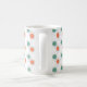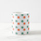 This mug has a mid-century modern design of circles with lines behind in orange and green.