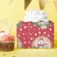 A cute Christmas wrapping paper for kids with a polar bear and his snowman friend pattern on a red background with pinkish polka dots .