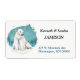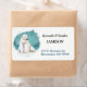This unique return address label features a stunning watercolor image of a polar bear sitting in the snow on a blue snowy night. Predominant colors are blue, teal, gray, and white. Your custom text is in black and blue at the right.