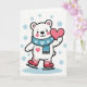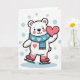 This Valentine’s Day greeting card features a cheerful white polar bear standing proudly on bright red ice skates. The bear wears white socks with simple stripes, has soft pink cheeks, pink inner ears, big friendly eyes, and a wide smile that feels warm and inviting. Wrapped around its neck is a light blue scarf decorated with small heart shapes, with short fringe ends hanging down. In one paw, the bear holds a large shiny pink heart, offering it sweetly to someone special ❤️. The background is bright white with scattered light blue dots that look like falling snow, and a pale blue line beneath the skates suggests icy ground. There is no text on the front, letting the artwork share the message on its own. It’s a charming, caring card perfect for Valentine’s Day, winter love, or a thoughtful note to someone you adore