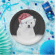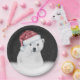 Polar bear wearing Santa Claus hat in snowflakes on black background.