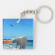 Pictured on the beach is a Polar bear meeting a fox terrier.