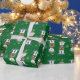 A classic green Christmas wrapping paper with the fun pattern of a polar bear carrying two gifts under the snow . This design is also available in blue and pink .