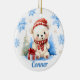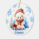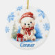Bring wintry charm to your tree with this adorable personalized polar bear ornament! Featuring a watercolor bear in a red scarf and hat, holding a gift and sitting among snowy trees and blue snowflakes, this ceramic keepsake includes your child’s name in soft blue script. A perfect holiday gift for toddlers, kids, or baby’s first Christmas, this ornament makes a thoughtful keepsake they'll look forward to hanging year after year.