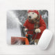 A polar bear wearing a red coat and hat skillfully operates a snowblower, sending plumes of snow into the air against a snowy backdrop