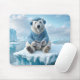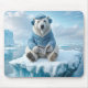 A polar bear wearing a blue sweater, earmuffs, and hat sits on an iceberg while holding a newspaper titled "Polar News."