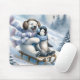 A polar bear and a penguin are joyfully sledding down a snowy hill, bundled up in cozy scarves and earmuffs