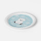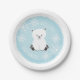Baby shower paper plates featuring an illustration of a baby polar bear and snowflakes over a blue background. Personalize the name.