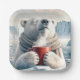 A content polar bear enjoys a steaming cup of hot beverage wrapped in a cozy scarf surrounded by a vast icy landscape.