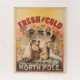 Vintage advertisement of a scene at the North Pole where polar bears are enjoying mugs of lager beer, with a trompe-l'oeil effect showing overheated people, with fans and sunshades, and one man reaching into the scene for a frosty fresh and cold mug of lager beer offered to him by a polar bear.
