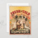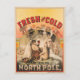 Vintage advertisement of a scene at the North Pole where polar bears are enjoying mugs of lager beer, with a trompe-l'oeil effect showing overheated people, with fans and sunshades, and one man reaching into the scene for a frosty fresh and cold mug of lager beer offered to him by a polar bear.