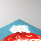 This image features two polar bears in a heartwarming embrace, set against a snowy, teal-toned background. The larger bear wears a red knit hat, decorated with subtle patterns, while the smaller bear is wrapped in a bright red scarf. Both bears have soft, rosy cheeks and serene expressions, creating a cozy and affectionate winter atmosphere. The textured, painterly style enhances the warmth and charm of the scene.